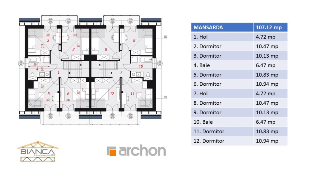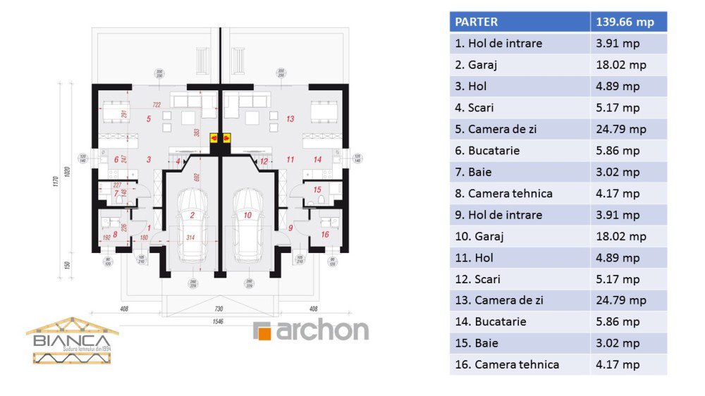 Daca intentionezi sa iti construiesti o casa moderna si functionala, iti recomandam acest duplex structurat pe parter si mansarda, care ofera doua unitati locative extrem de generoase.