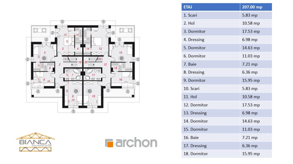 Este structurata in 2 unitati locative mari, care acopera toate necesitatile unor familii numeroase.