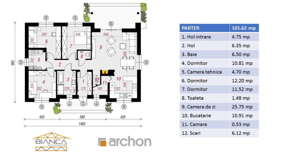 In ceea ce priveste interiorul, acesta este compartimentat in asa fel incat sa asigure confort pentru o familie cu cel putin 4 persoane, care isi doreste sa se extinda in viitor.