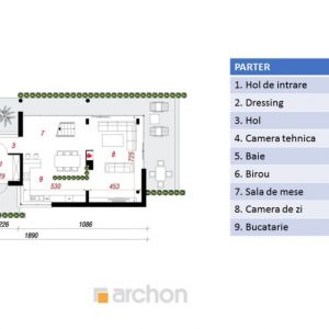 Parterul casei este compus dintr-un living urias, unit cu bucataria si cu sala de mese intr-un spatiu deschis ce ajunge la peste 60 de metri patrati. Tot la parter se regaseste un dressing mare, o baie, un birou si o camera tehnica.